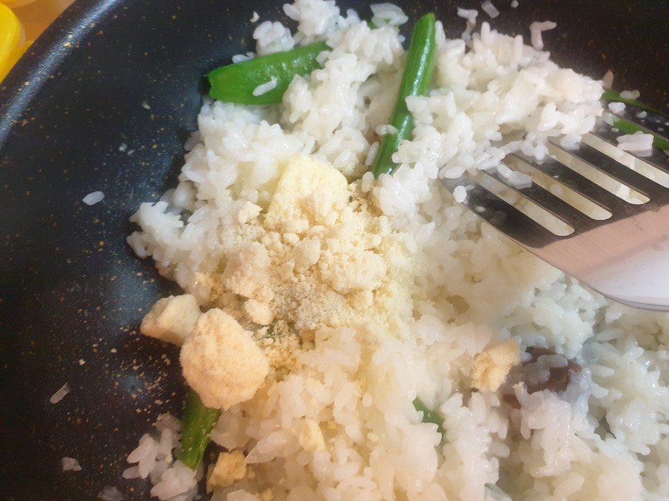 물이 어느정도 없어지면 불을 줄이고 치즈가루 한스푼 , 버터 10g , 간장 작은 스푼을 넣어줍니다.