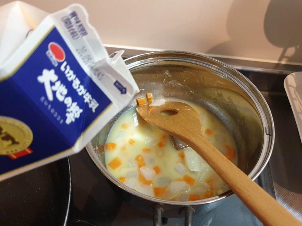 조금 녹았다 싶으면 다음으로는 콘소메를 넣어주세요!