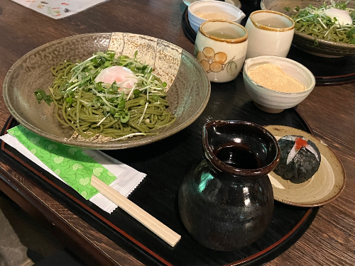 차소바 세트에는 차소바와 미니 주먹밥, 와라비모치, 따뜻한 차가 함께 나오는데요.