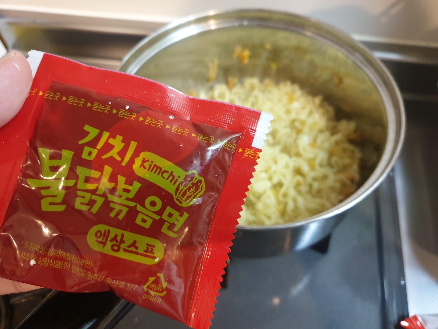 商品名の通り、ブルダック炒め麵にキムチが入りました。