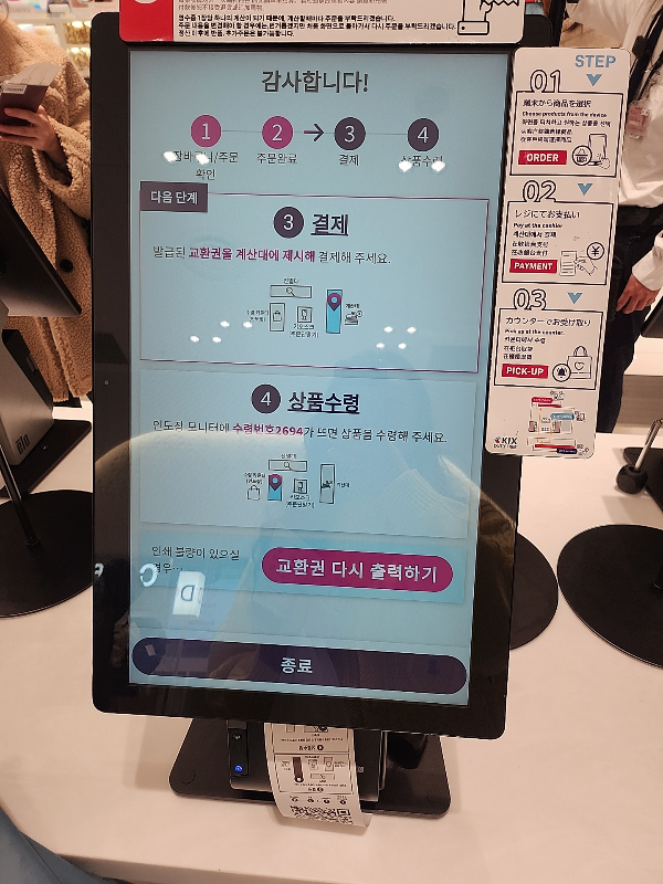 그 종이를 가지고, 키오스크 단말기 반대편에 있는 계산대로 가야합니다.