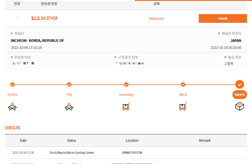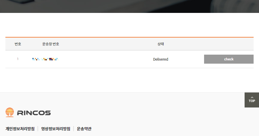 살짝 창을 내리면 위의 사진과 같이 운송장 번호 옆에 상태 표시 및 'check'라는게 나와요.