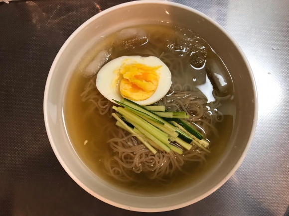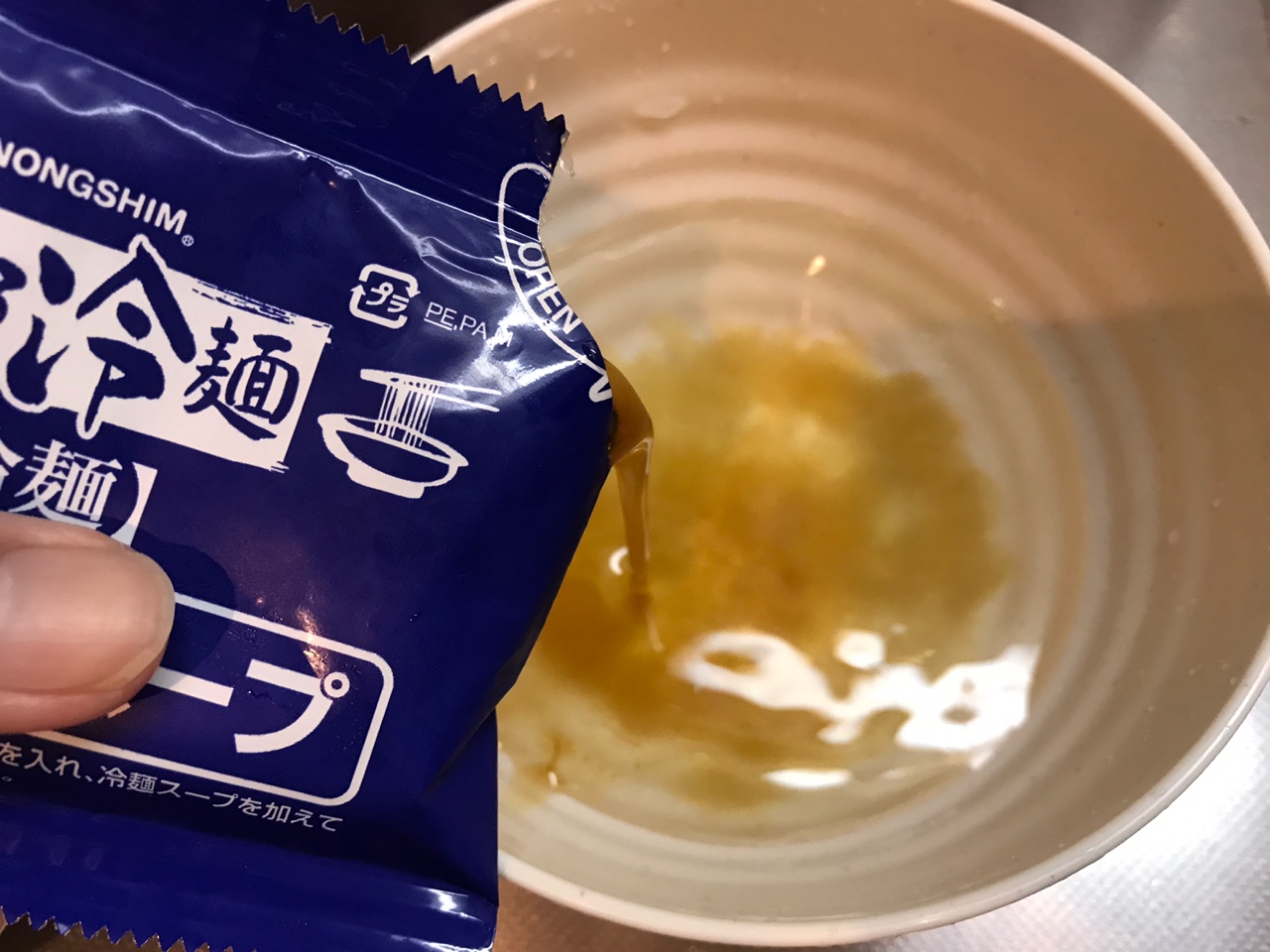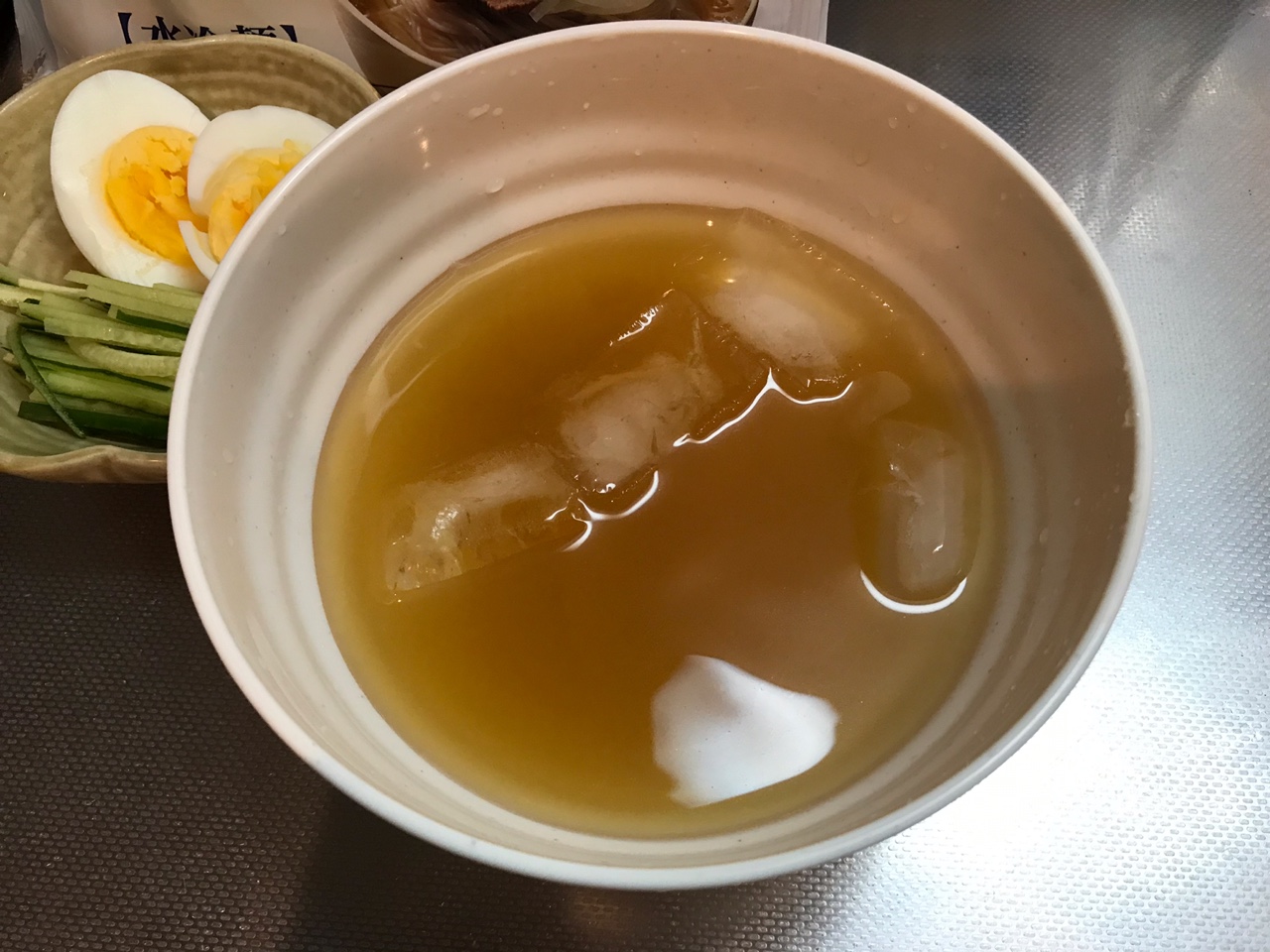 お酢を入れようか迷ったのですが、全然お酢入れなくて韓国でよく食べてる水冷麺の味がしました。