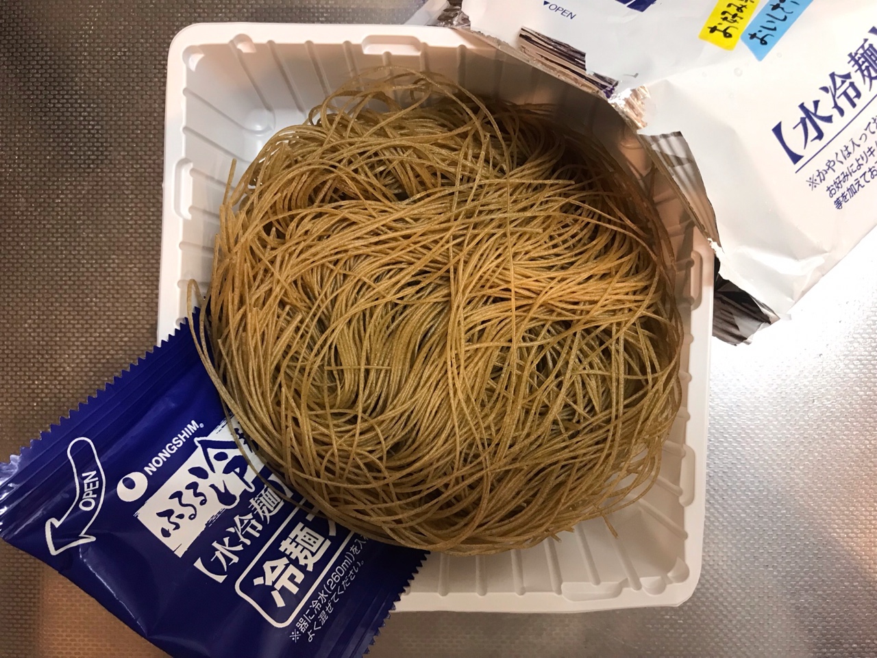 水冷麺とビビン冷麺二つの種類があって、どちらも買いましたが今回は水冷麺にしました。