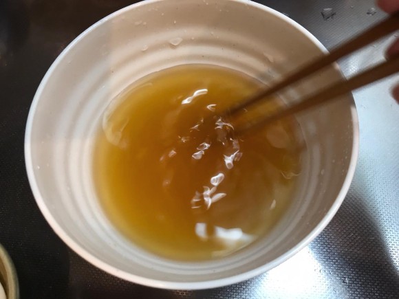 しっかりと水を切った麺を水とスープを混ぜた器に入れます。