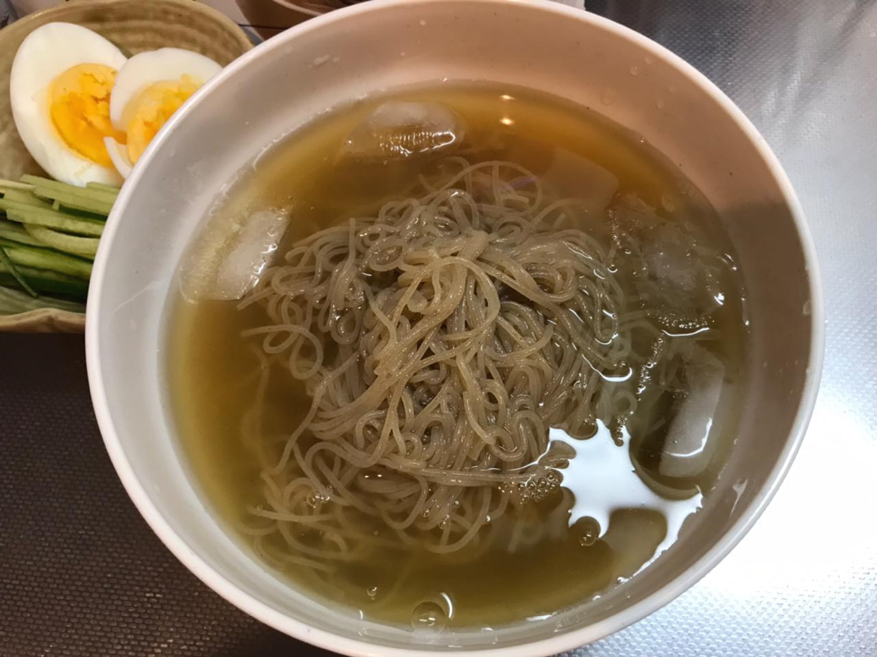 お酢を入れようか迷ったのですが、全然お酢入れなくて韓国でよく食べてる水冷麺の味がしました。
