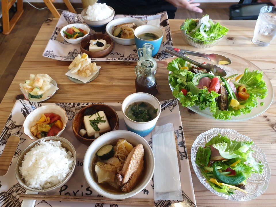샐러드, 샐러드김치, 양파와 새우의 굴튀김, 흙마늘과 두부, 닭날게 감자조림, 야채듬뿍 냉국 이었습니다.