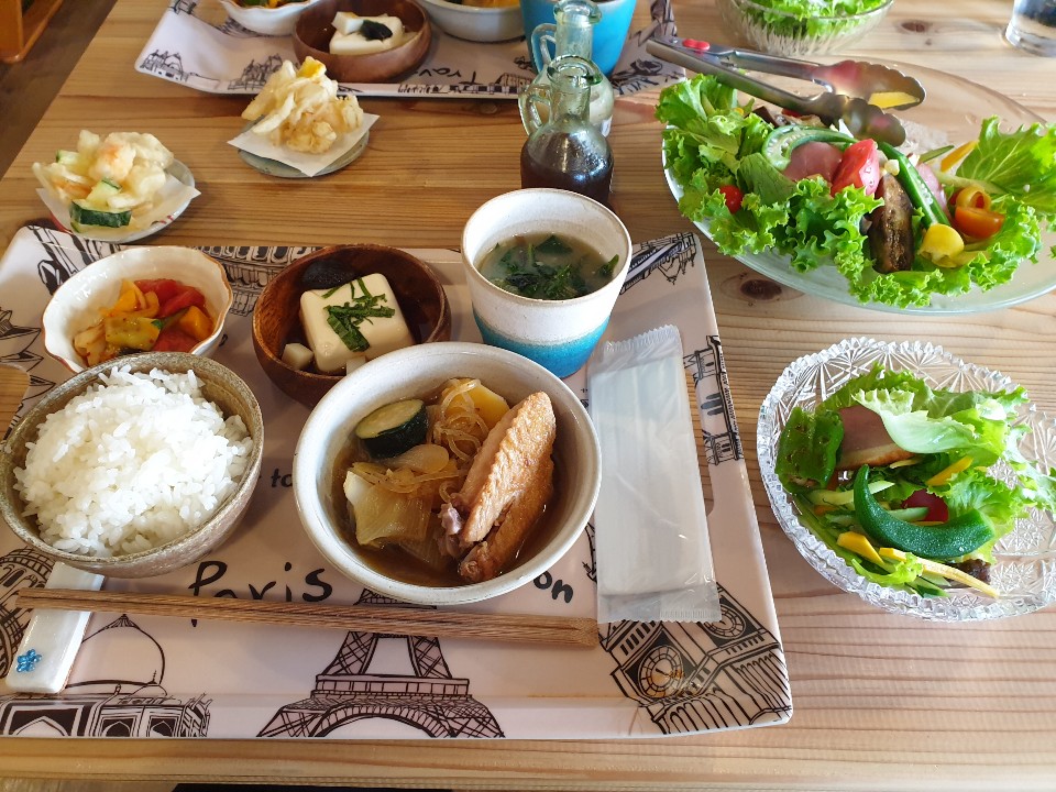 샐러드, 샐러드김치, 양파와 새우의 굴튀김, 흙마늘과 두부, 닭날게 감자조림, 야채듬뿍 냉국 이었습니다.