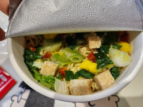 3분 뒤, 뚜껑을 열어보니 내용물들이 맛있게 익었습니다.