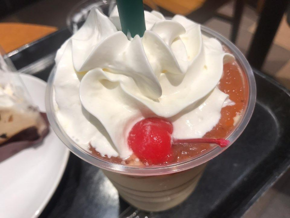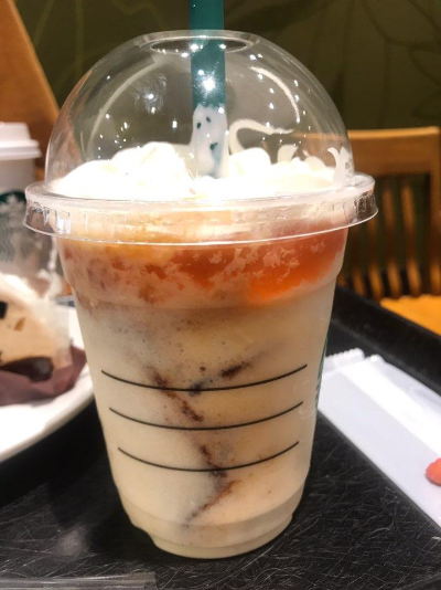 그리고 음료는 그냥 커피를 마실까 하다가...여기서도 새 음료가 보였기에 쿠폰을 써서 새론온 푸딩 아라모드 프라푸치노(プリンアラモードプラペチーノ)를 함께 주문했습니다.
