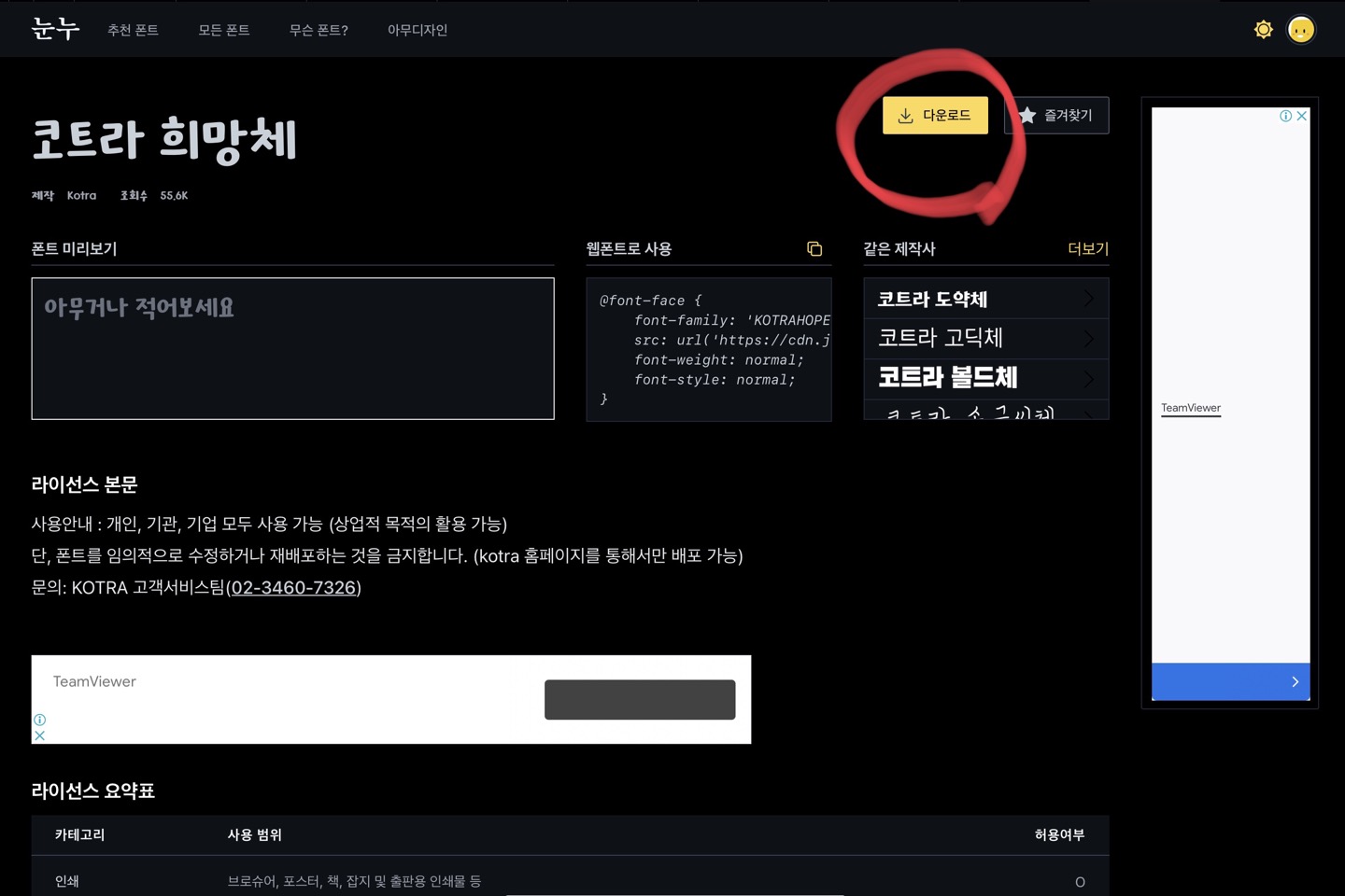원하는 폰트를 찾아 클릭 해 주면, 위와 같이 다운로드 받을 수 있는 페이지가 나옵니다.