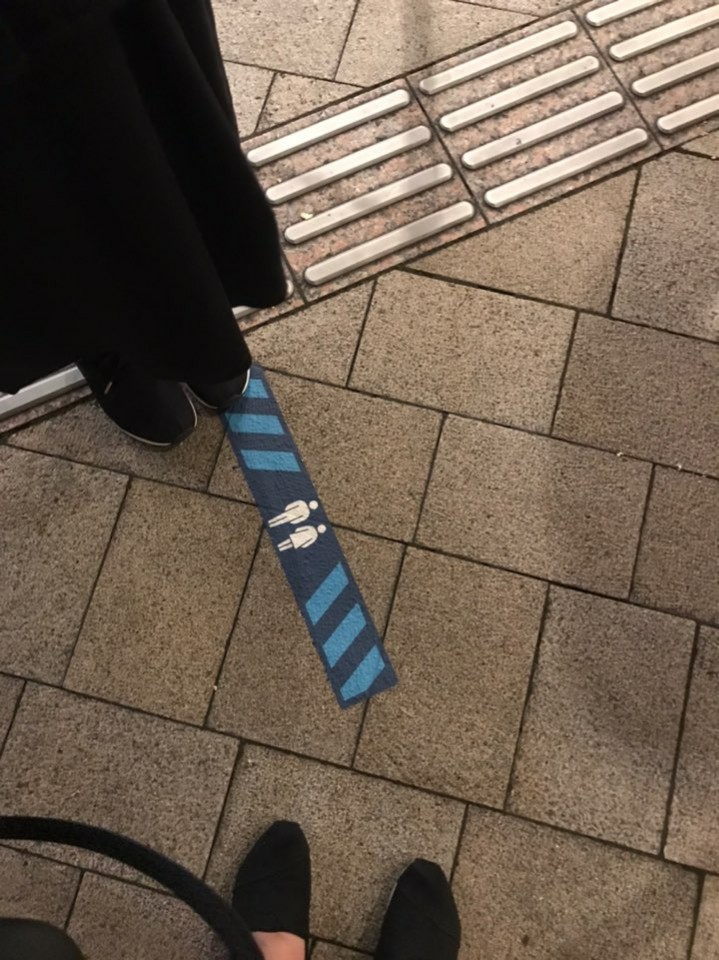 사람들이 모이는 곳의 경우에는 위의 사진처럼 사회적 거리를 둘 수 있게 바닥에 스티커가 부착되어 있었습니다.