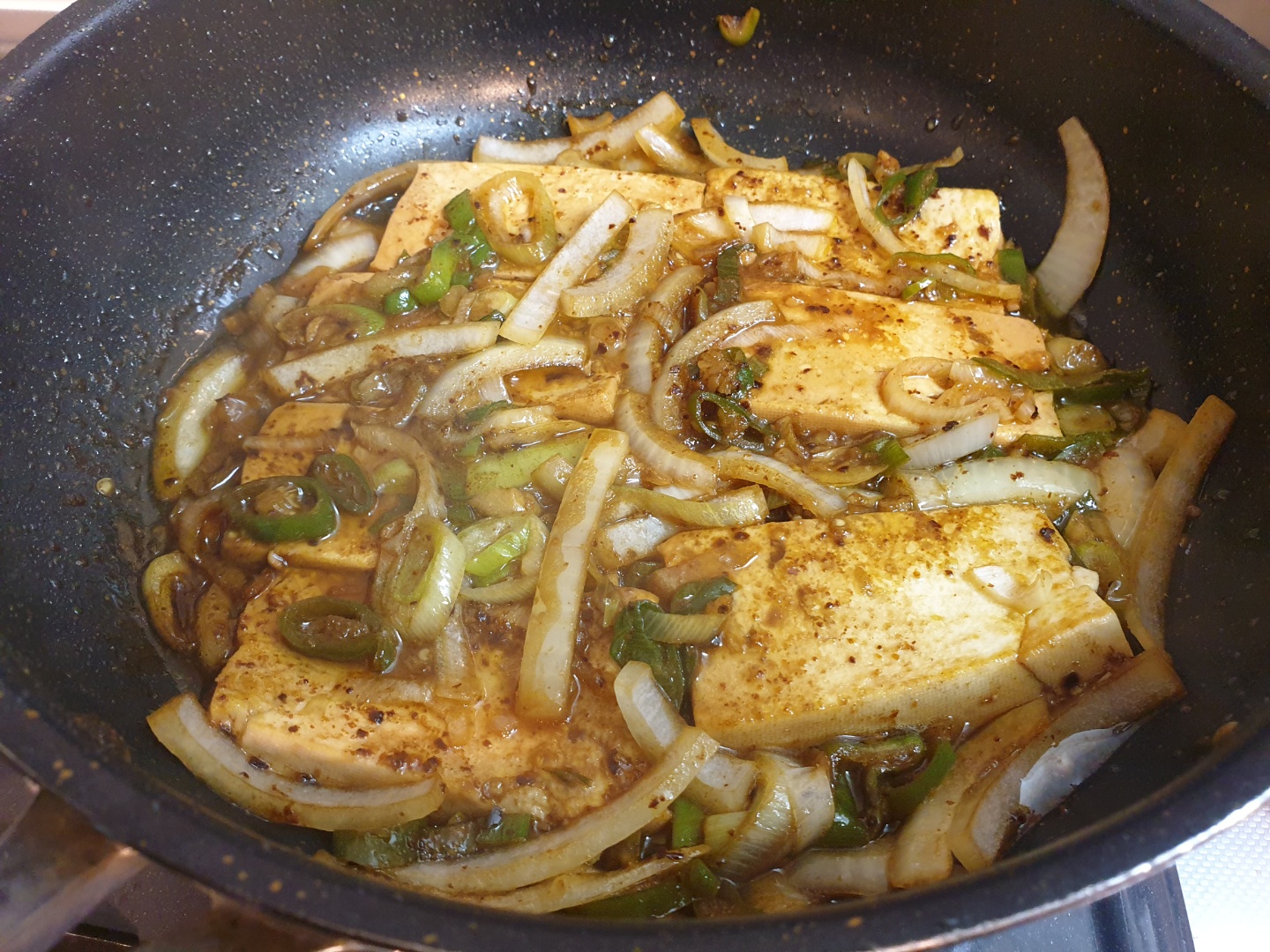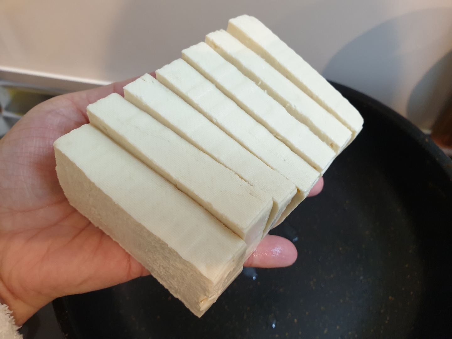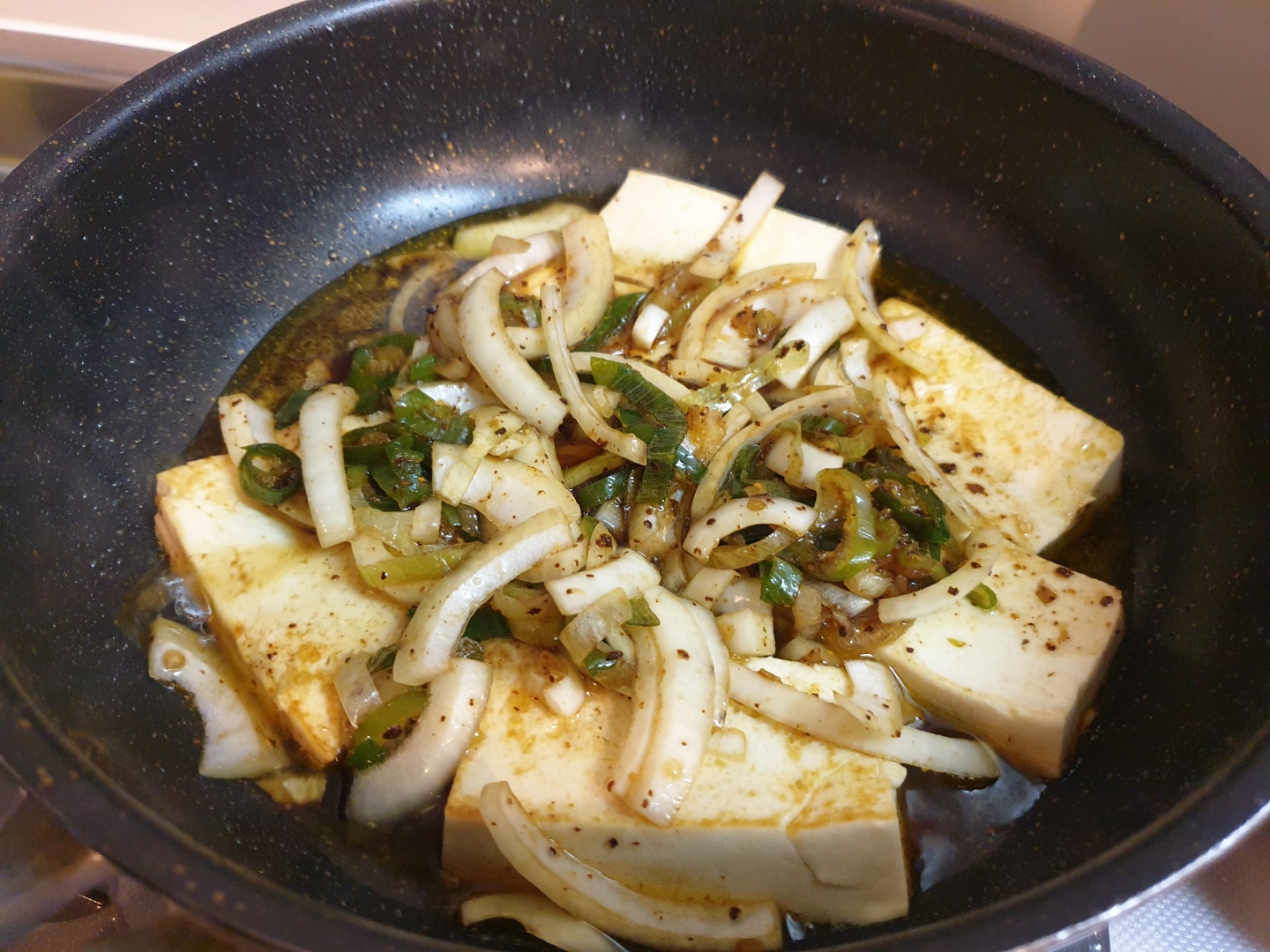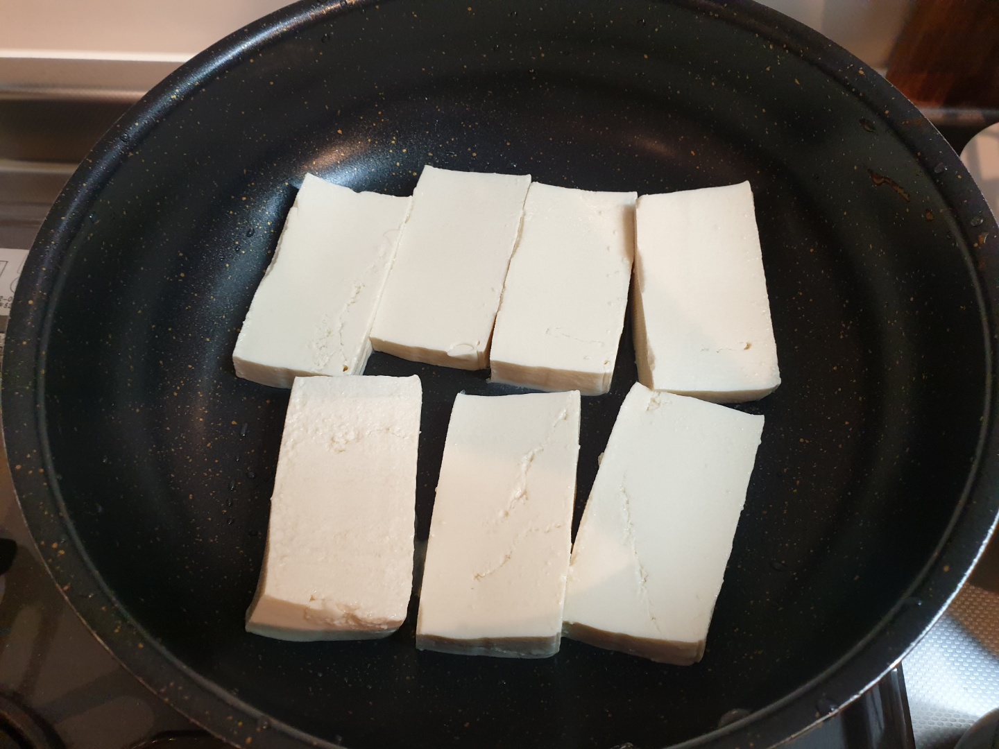 두부를 후라이팬에 놓아주고, 기름을 자작하게 넣어줍니다.