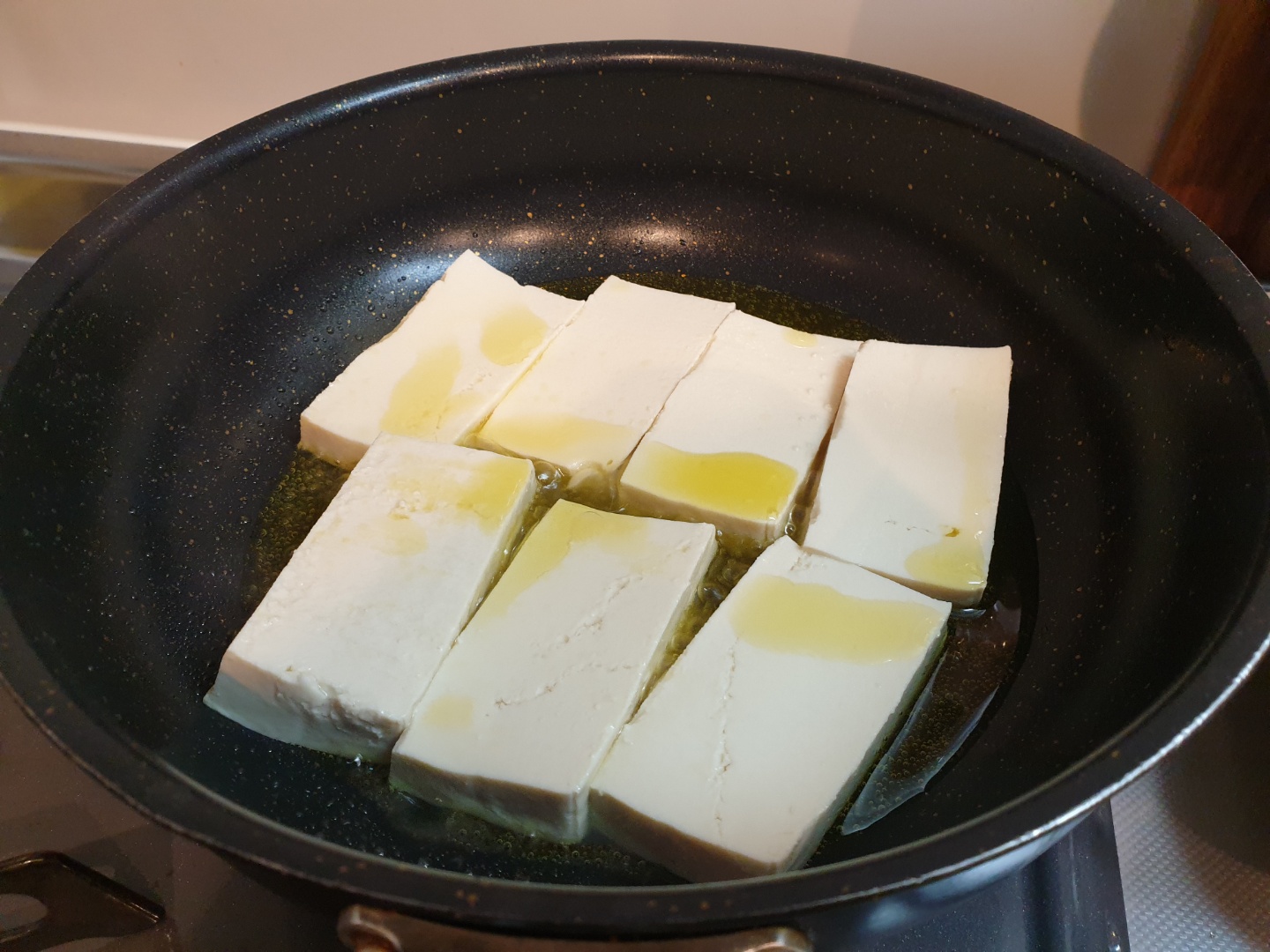 두부를 후라이팬에 놓아주고, 기름을 자작하게 넣어줍니다.