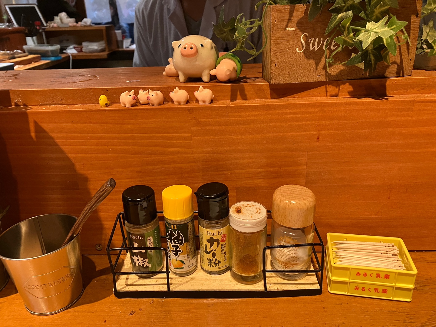 왼쪽부터 산초가루 / 유자후추 / 카레가루 / 이치미? / 소금 이 있었습니다.