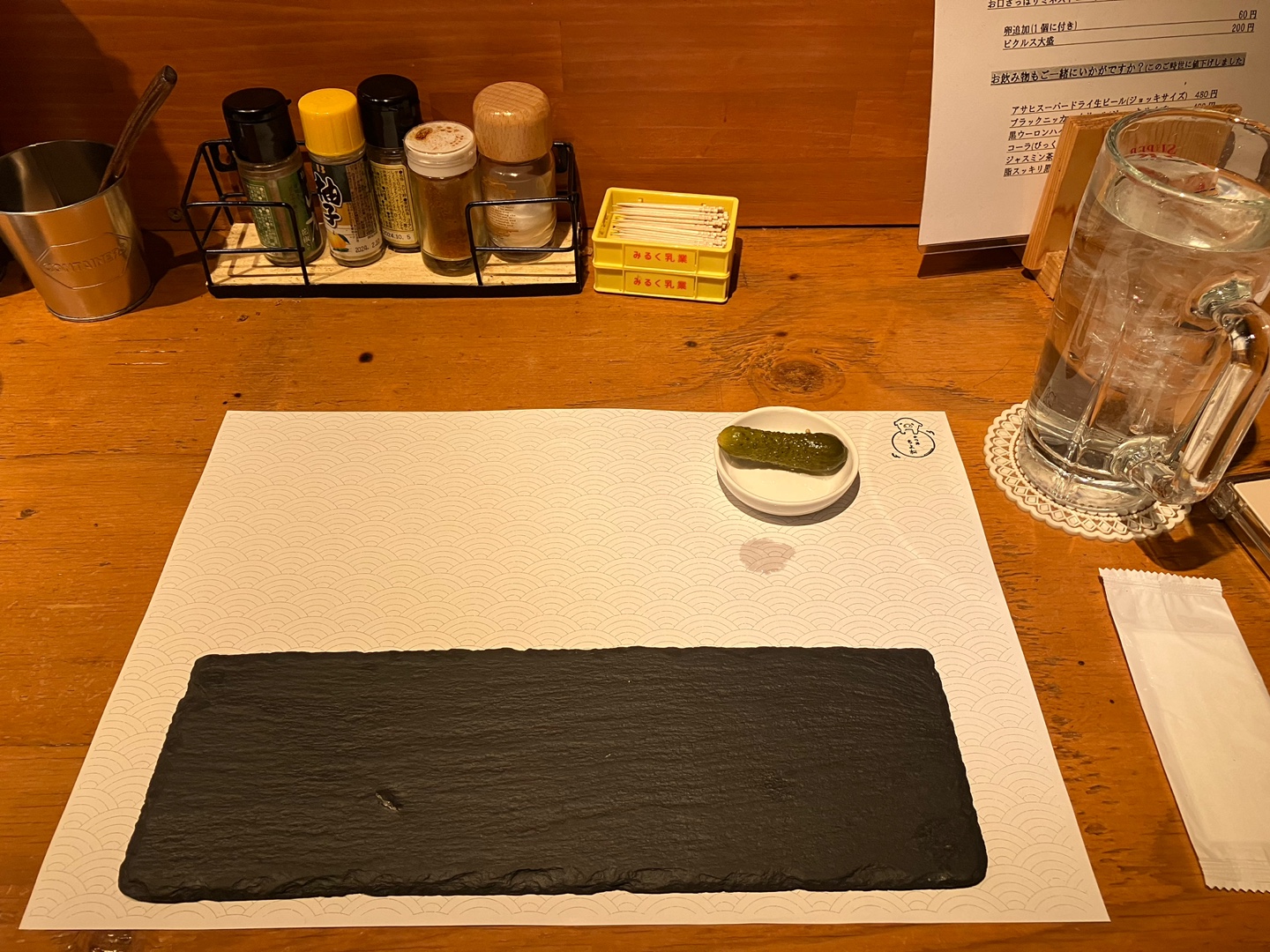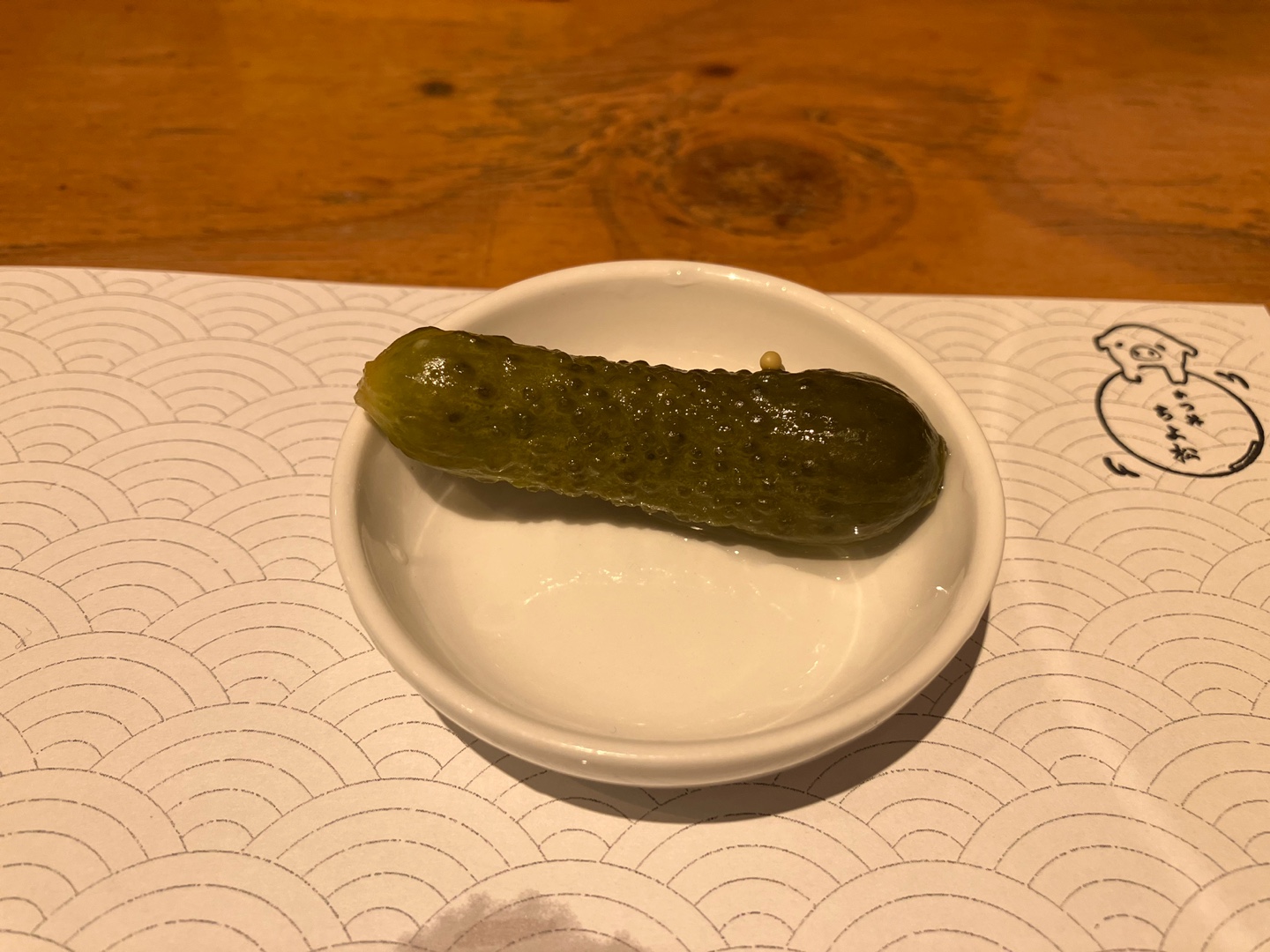 주문 후 기다리는 동안 오이 피클이 나왔어요.