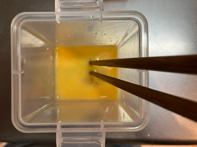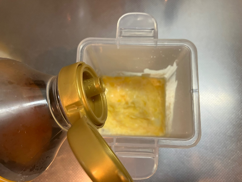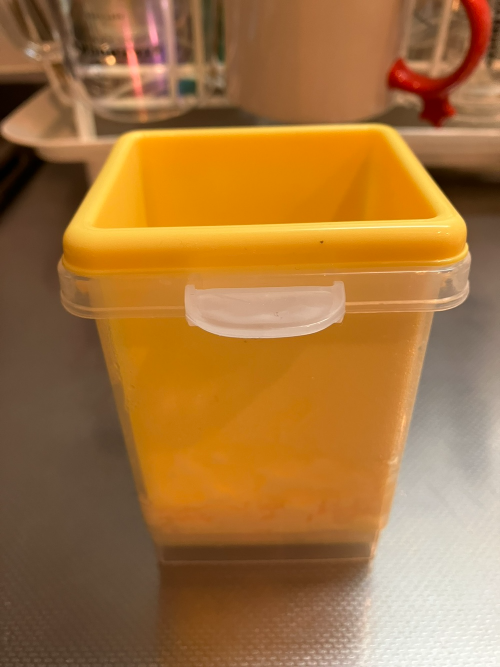 전자렌지를 돌린 후에, 투명 케이스를 꺼내서 노란색 케이스를 겹쳐준 후 양 옆에 있는 고정핀(?)으로 고정을 해 줍니다.