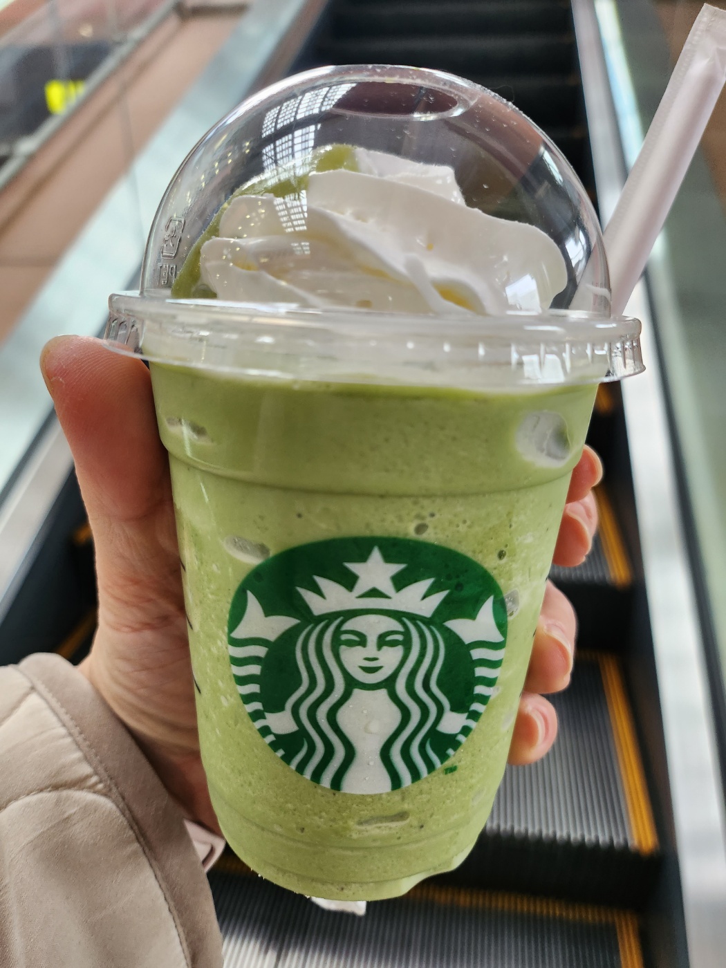 저는 마차현미차 모치 프라푸치노 (抹茶玄米茶もちプラペチーノ)를 주문했으며 세금 포함해서 690엔 이었습니다.