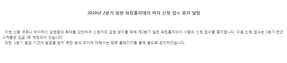오늘 보니 2020년 2분기 일본 워킹홀리데이 비자 신청 접수가 중지되었다는 공지가 일본 대사관에 떠 있더라구요. 이하 전문입니다.