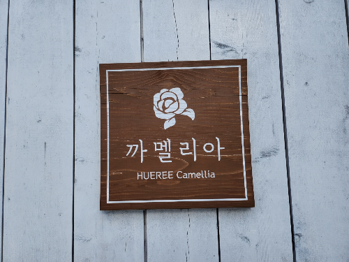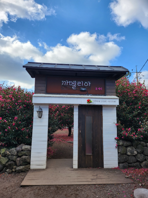 동백정원 옆에 휴애리 간판과 동백이 너무 예쁘더라고요!
