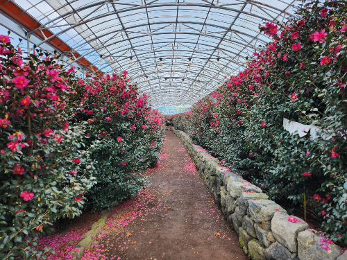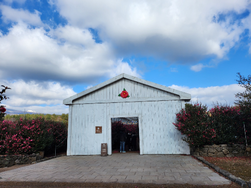 하얀색의 나무로된 온실(?)건물 안에도 동백이 가득 했습니다!