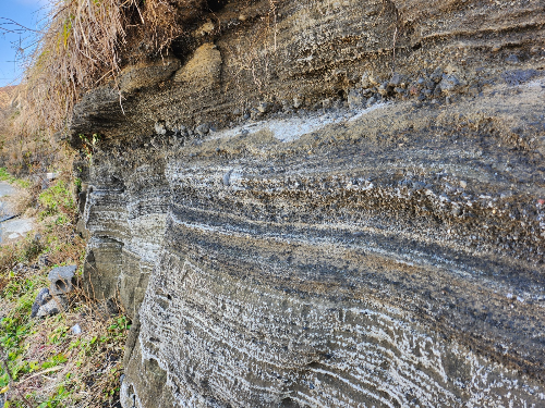 수월봉에 가까워지니 처음에 봐왔던 지층과는 조금 다른 하얀색의 지층들이 벽처럼 멋지게 이어졌어요.