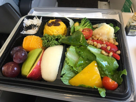 샐러드와 싱싱한 과일들이 가득 들어있는 기내식 입니다.