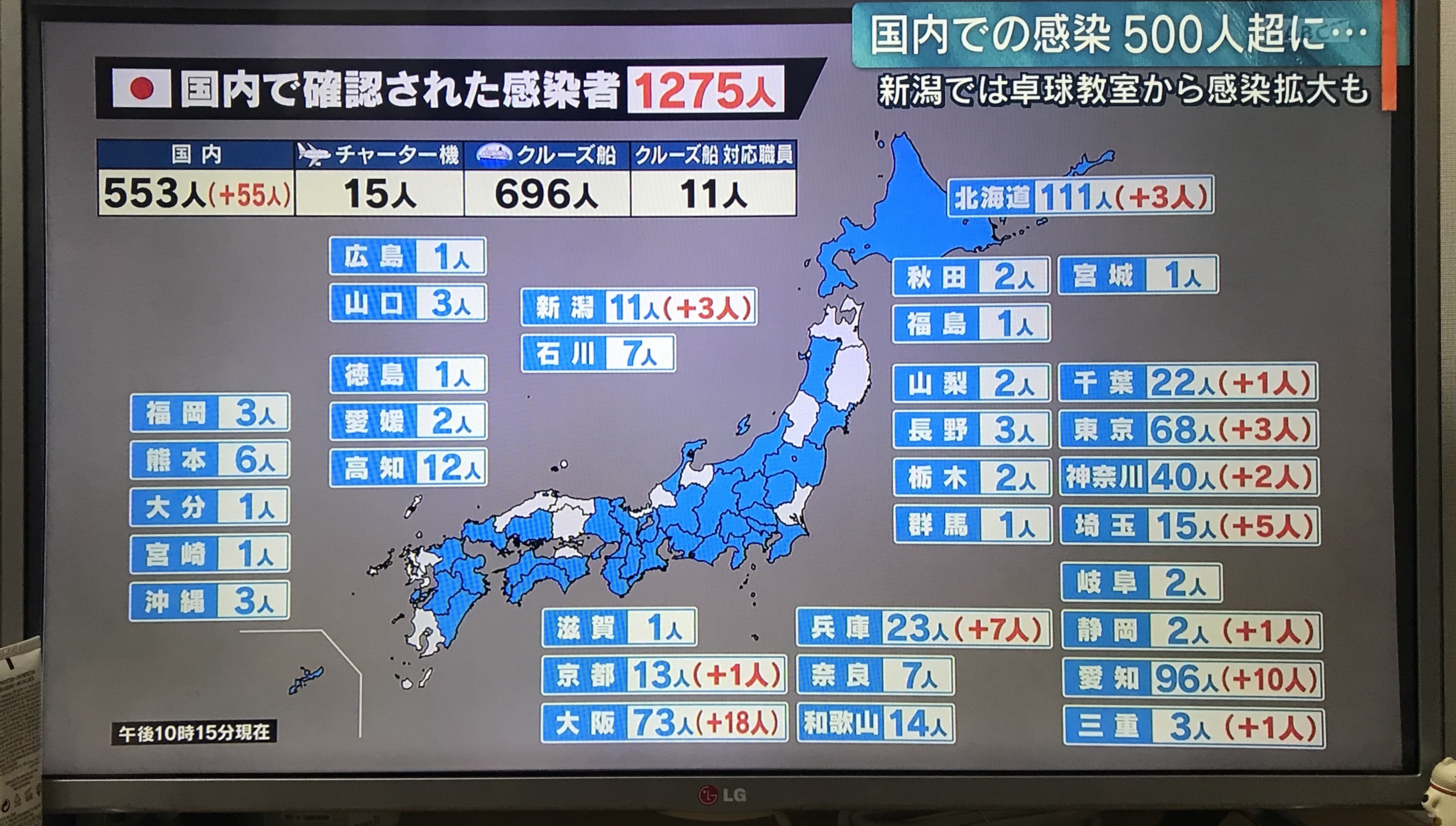 조금 전 뉴스에서 확인 했을 때는 크루즈 선을 제외하면 일본내 감염자 600명이 되었습니다.