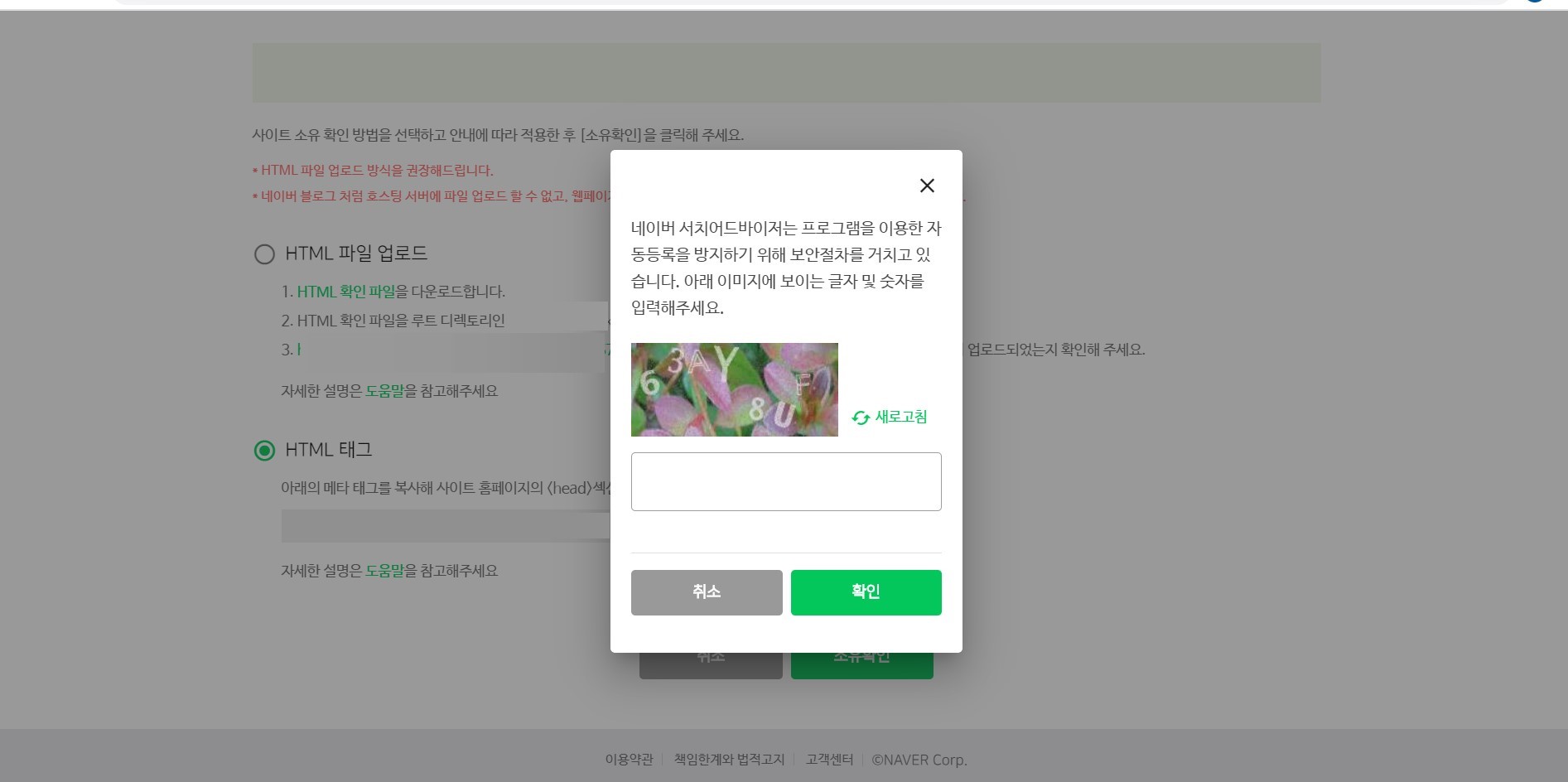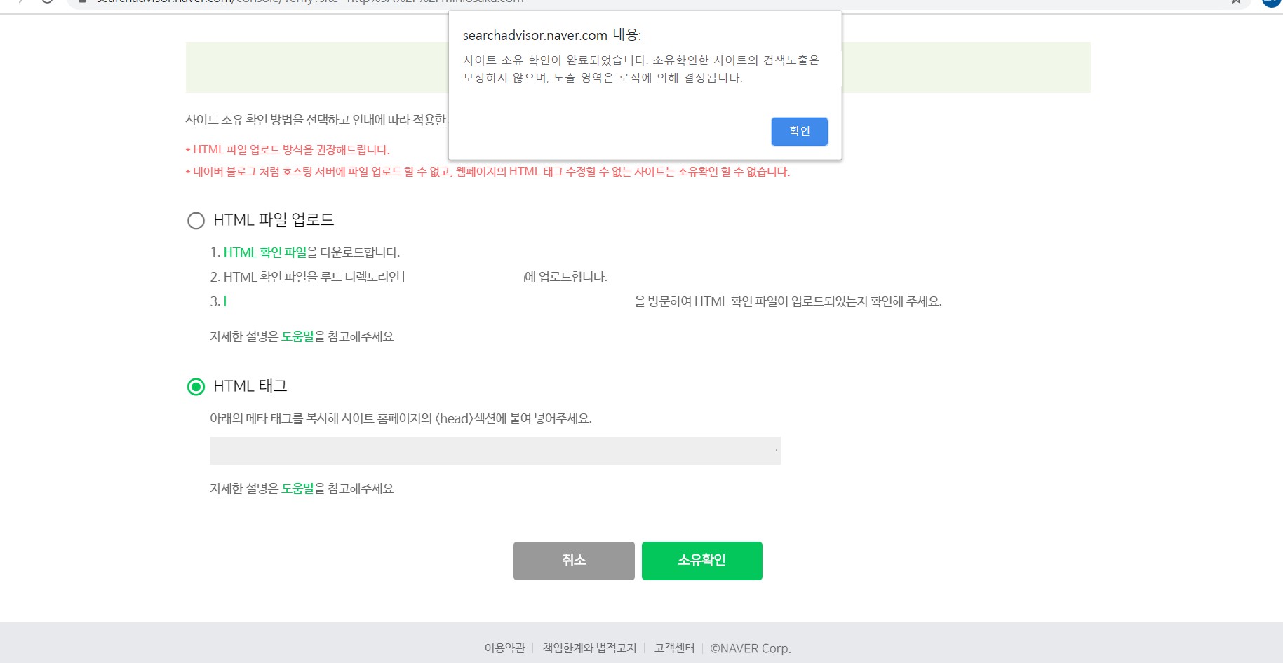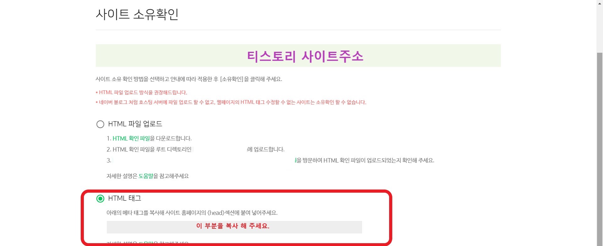 작성한 주소의 소유를 확인 해야하는데, 저는 HTML로 선택 하고, 복사를 했습니다.