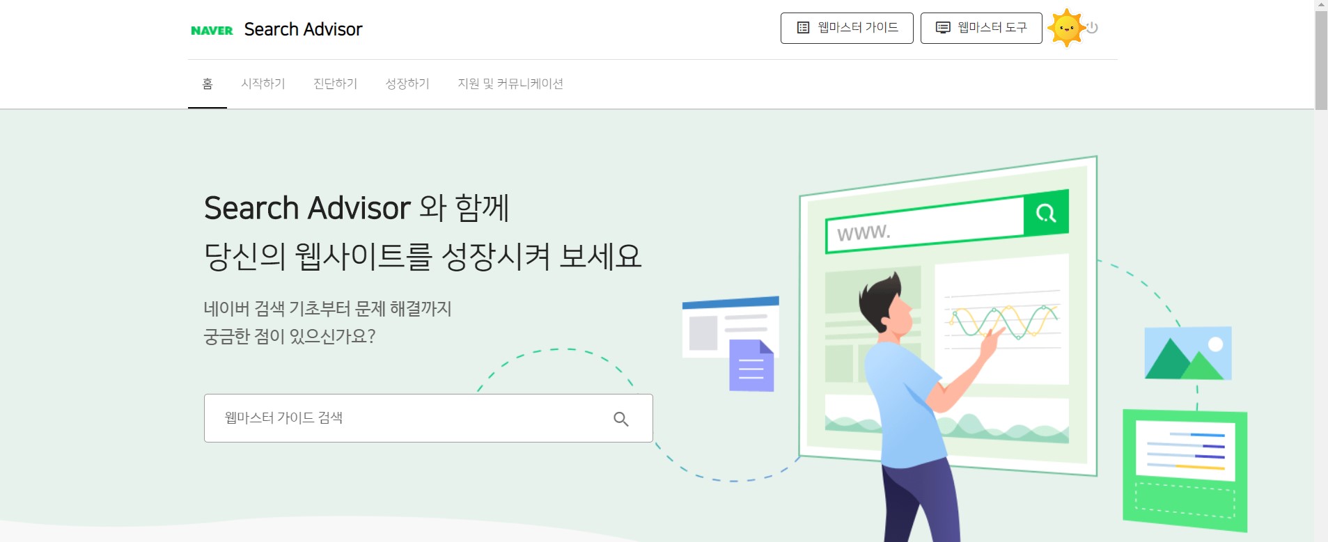 메인 페이지를 살짝만 내리셔도 위의 페이지와 같은 웹마스터 도구 사용하기 버튼도 있으니, 편하신 쪽으로 사용하시면 됩니다.