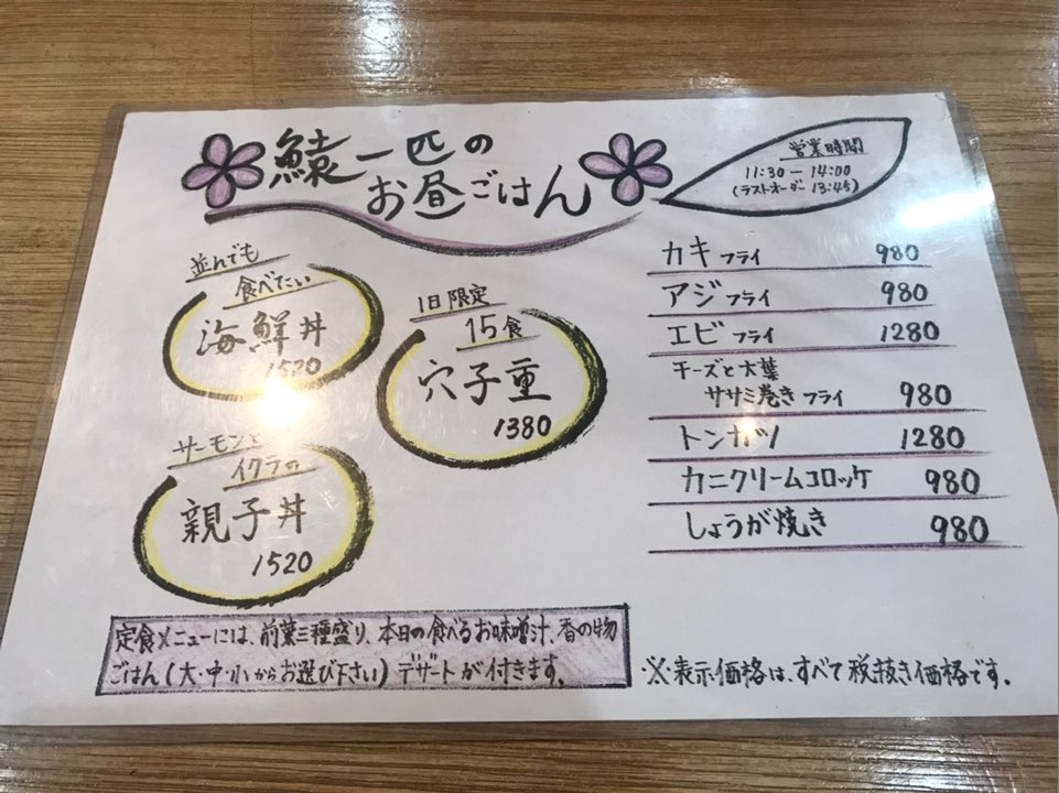 그 외에는 붕장어 덮밥, 오야코 덮밥(연어와 연어알), 굴튀김, 전갱이튀김, 새우튀김, 사사미마키 튀김, 돈까스, 게살크림고로케, 생강구이가 메뉴로 나와있었습니다.