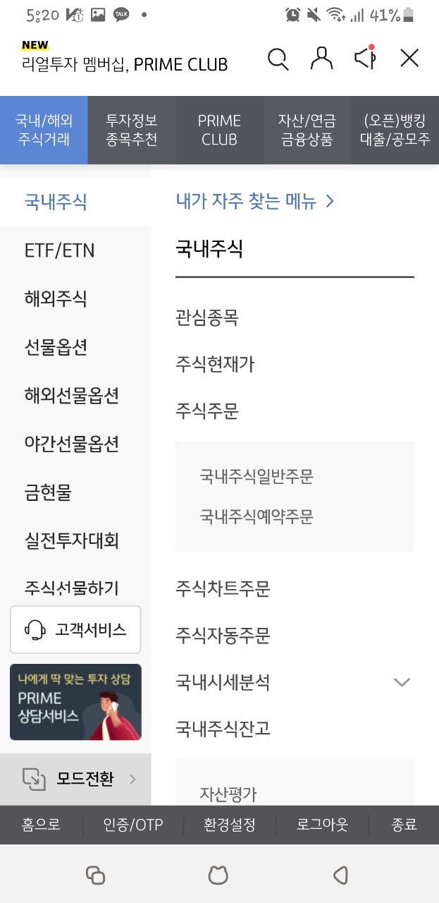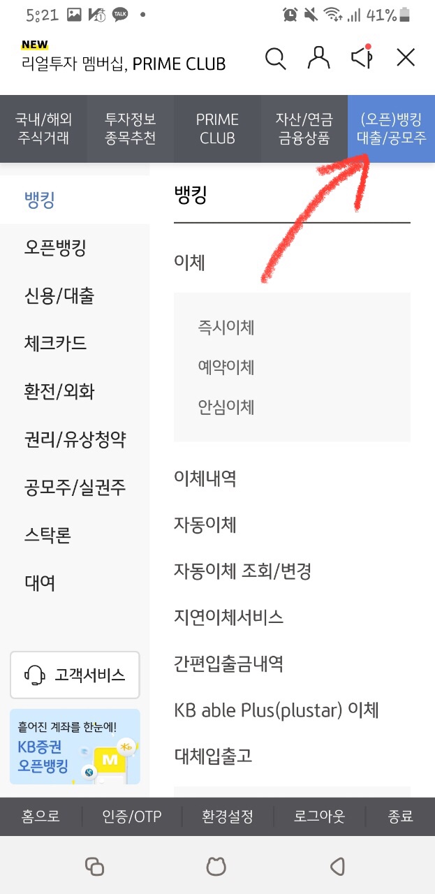그러면 사진과 같이 국내/해외 주식거래 - 투자정보 종목추천 - PRIME CLUB - 자산/연금 금융상품 - (오픈)뱅킹 대출-공모주 순으로 확인을 할 수 있습니다.