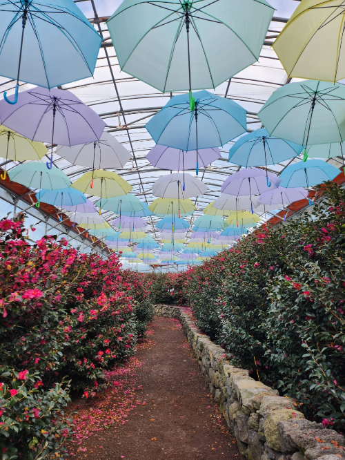 길이 하나였는데 길을 따라 양옆으로 동백이 가득하고, 끝으로 갈 수록 하늘에는 알록달록 우산들도 운치를 더했습니다.
